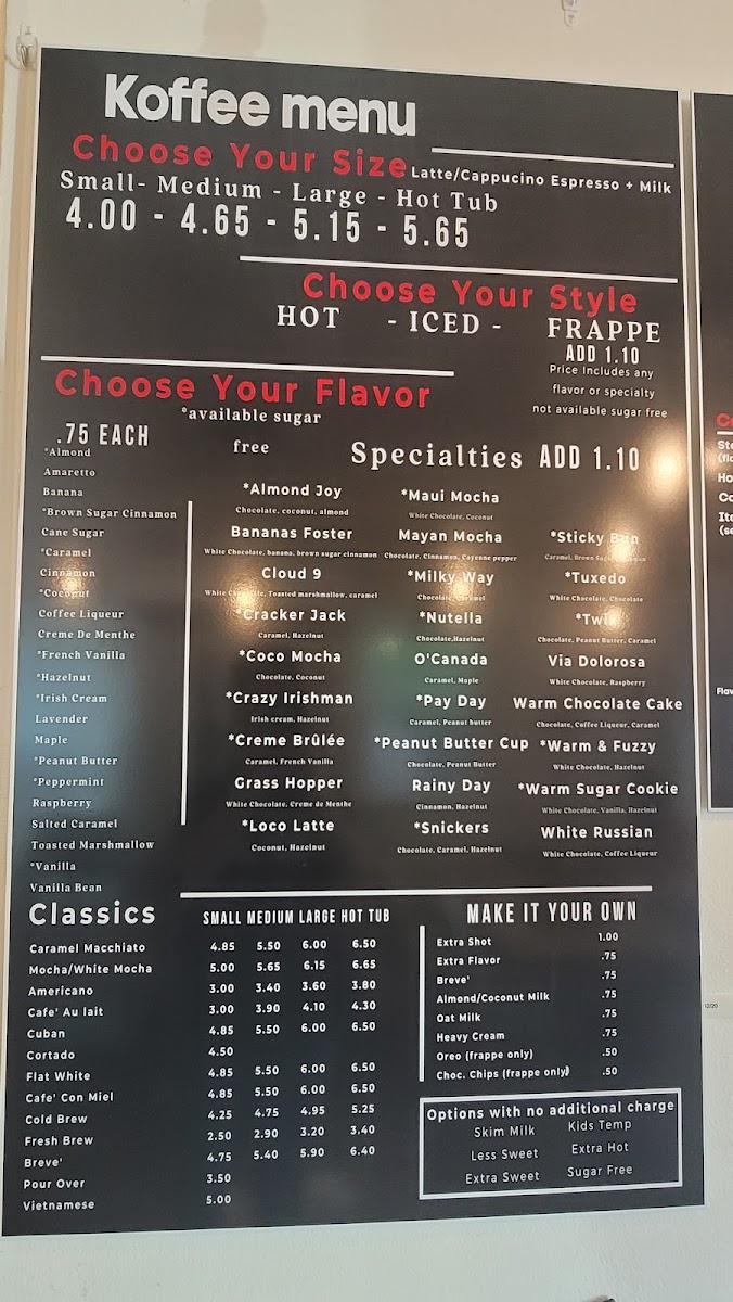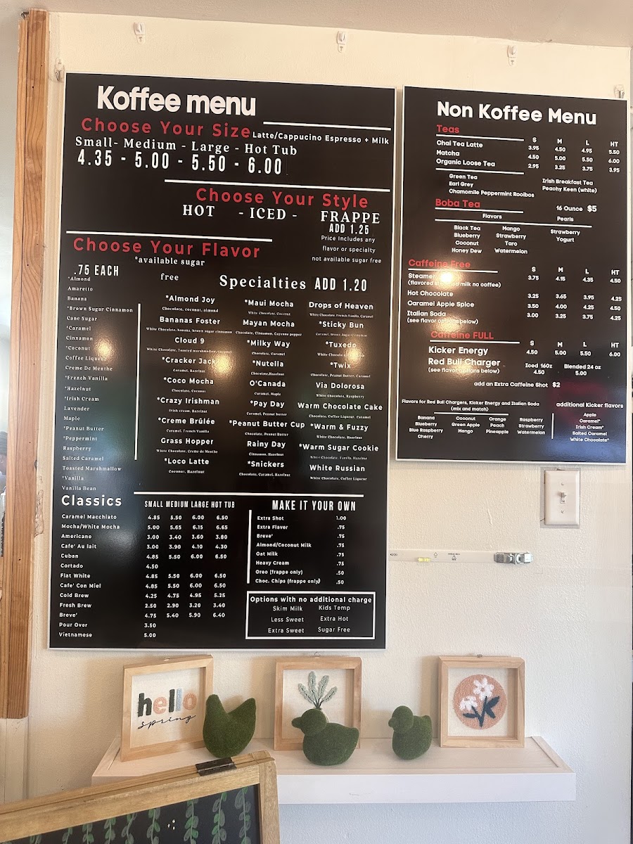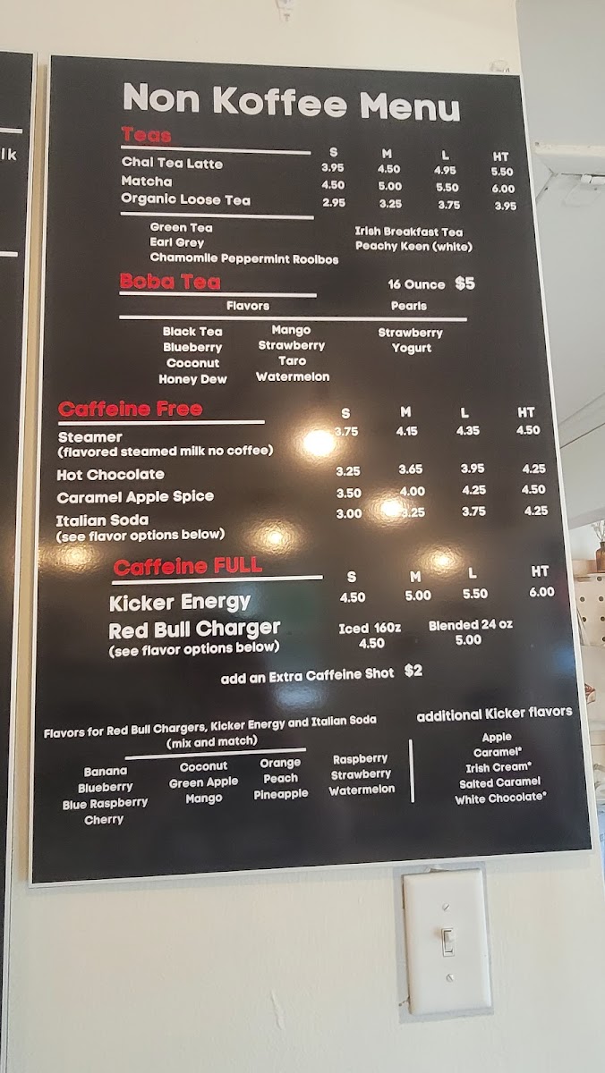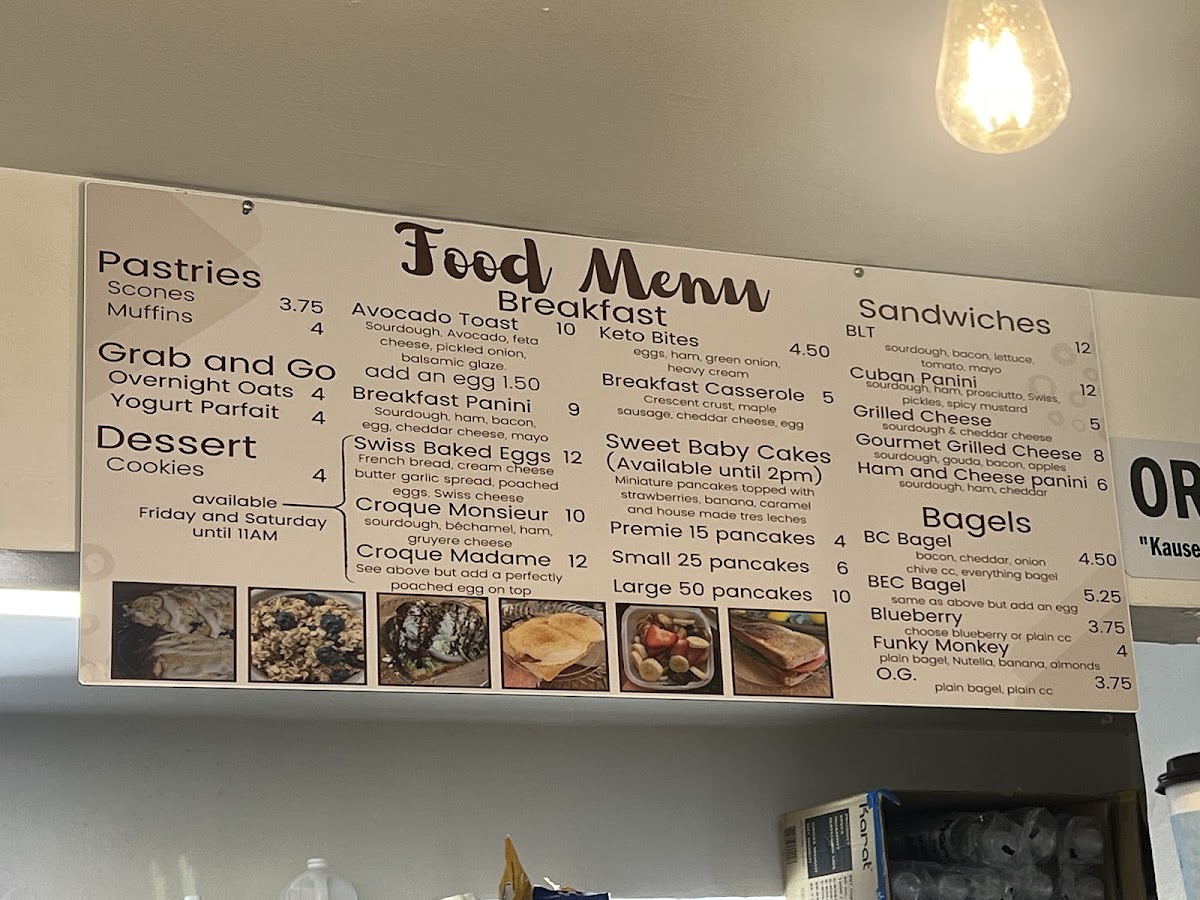 Koffee With a Kause offers a simple yet inviting café menu that balances comforting drinks with casual bites. The selection centers around well-crafted coffees and teas, including flavored lattes and specialty options like almond joy or banana-inspired blends, ideal for both a quiet morning or an afternoon pick-me-up. Alongside drinks, you’ll find a variety of freshly baked pastries and light snacks, from the Ultimate Blueberry Bagel to unique daily scones and baby pancakes, perfect for a relaxed breakfast or a midday treat.
